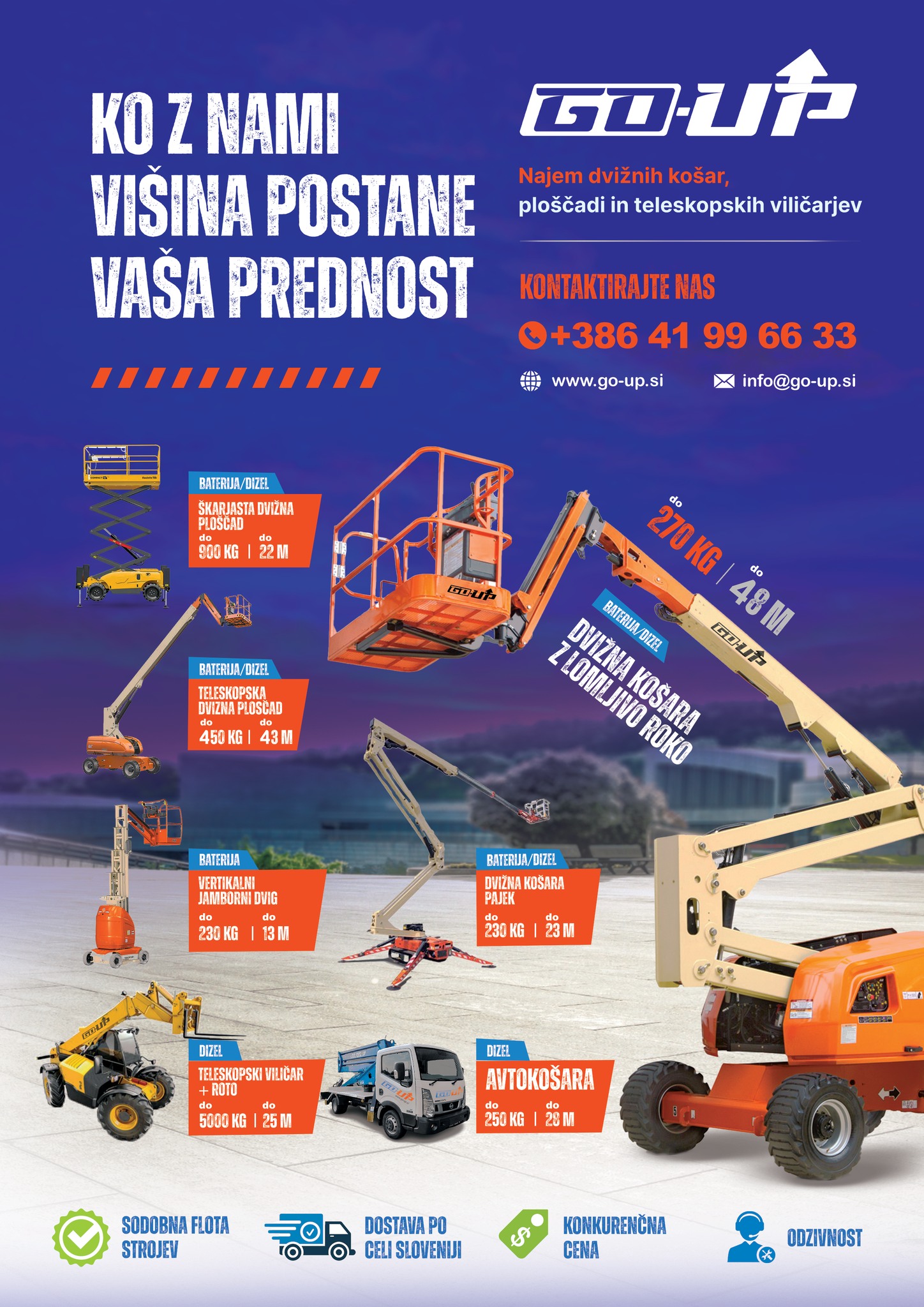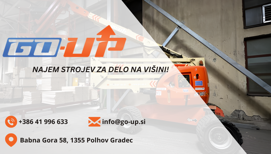 GO-UP Slovenija nudi najem avtokošare po celotni Sloveniji, z možnostjo samostojnega najema ali najema z izkušenim operaterjem. Zagotavljamo dostavo na lokacijo in hitro organizacijo, ne glede na zahtevnost projekta.